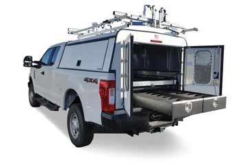 The Workforce truck cap seamlessly adds utility to any truck with its simple, functional design. Featuring folding T-handles on fiberglass side doors and an aluminum-framed rear door, it provides easy access to tools and equipment. Transform your truck into a reliable work vehicle with the practical and durable Workforce commercial cap.